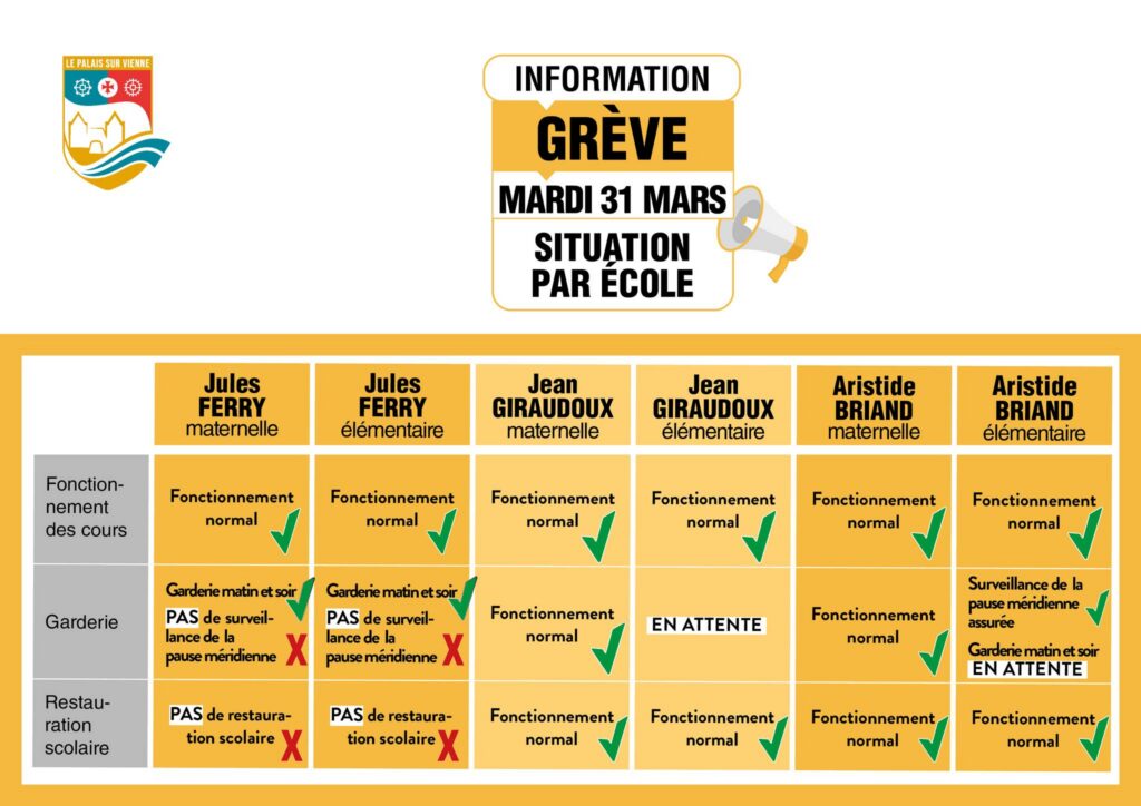 En raison de la grève du mardi 31 mars, veuillez trouver le récapitulatif des situations par école ci-dessous.